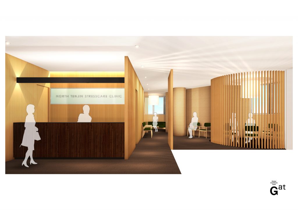 円形の窓があるビルの特徴を生かし、白木の格子で間仕切る事により、患者さん同士の視線が合わない様にデザインしました。