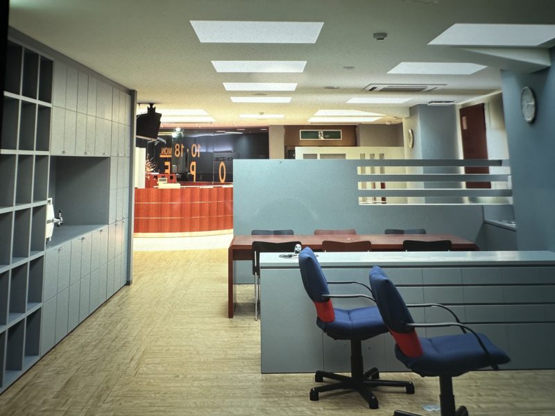約30年前のコンタクトショップ。家具や壁を全てブルーグレイで統一している。