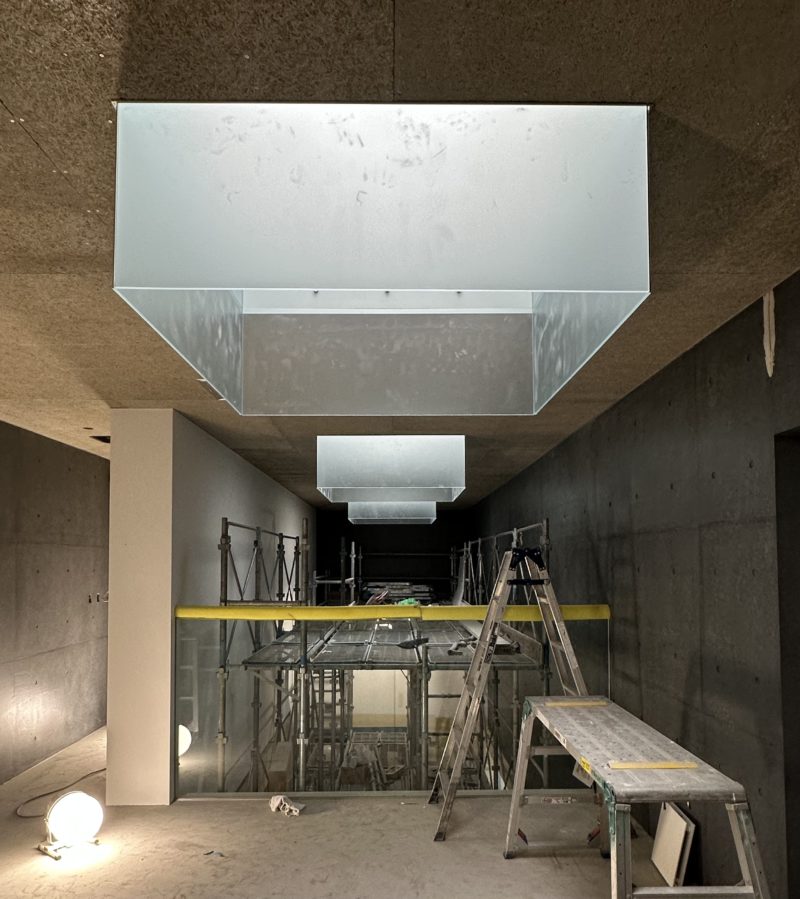 トップライトの下り壁を以前から他の物件でもイメージしていましたが、ポリカーボネートのガラス色を使って今回やっと実現しました。