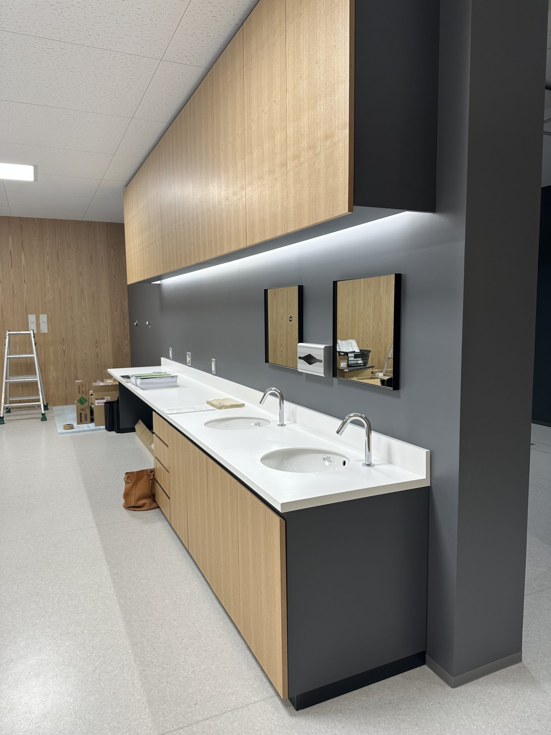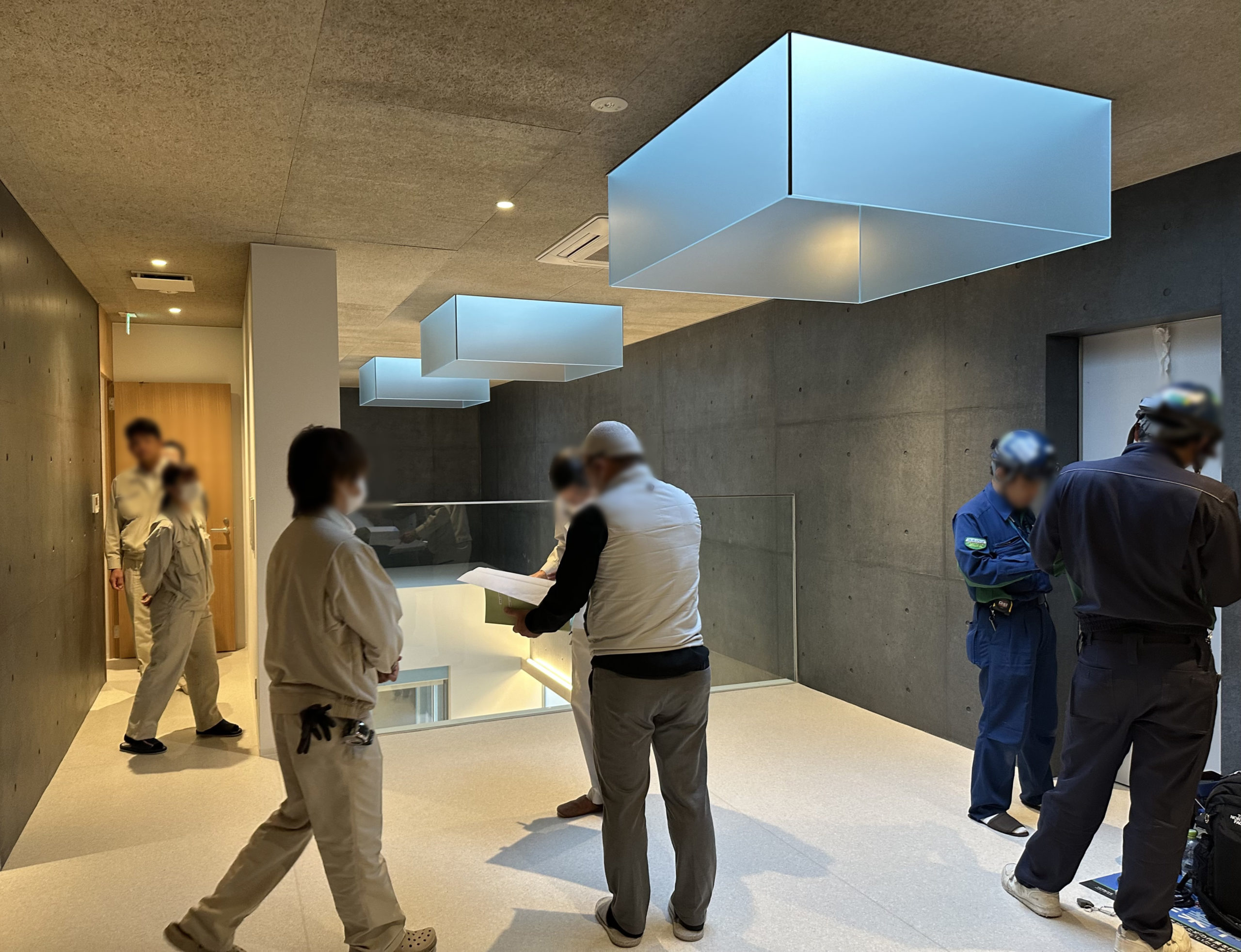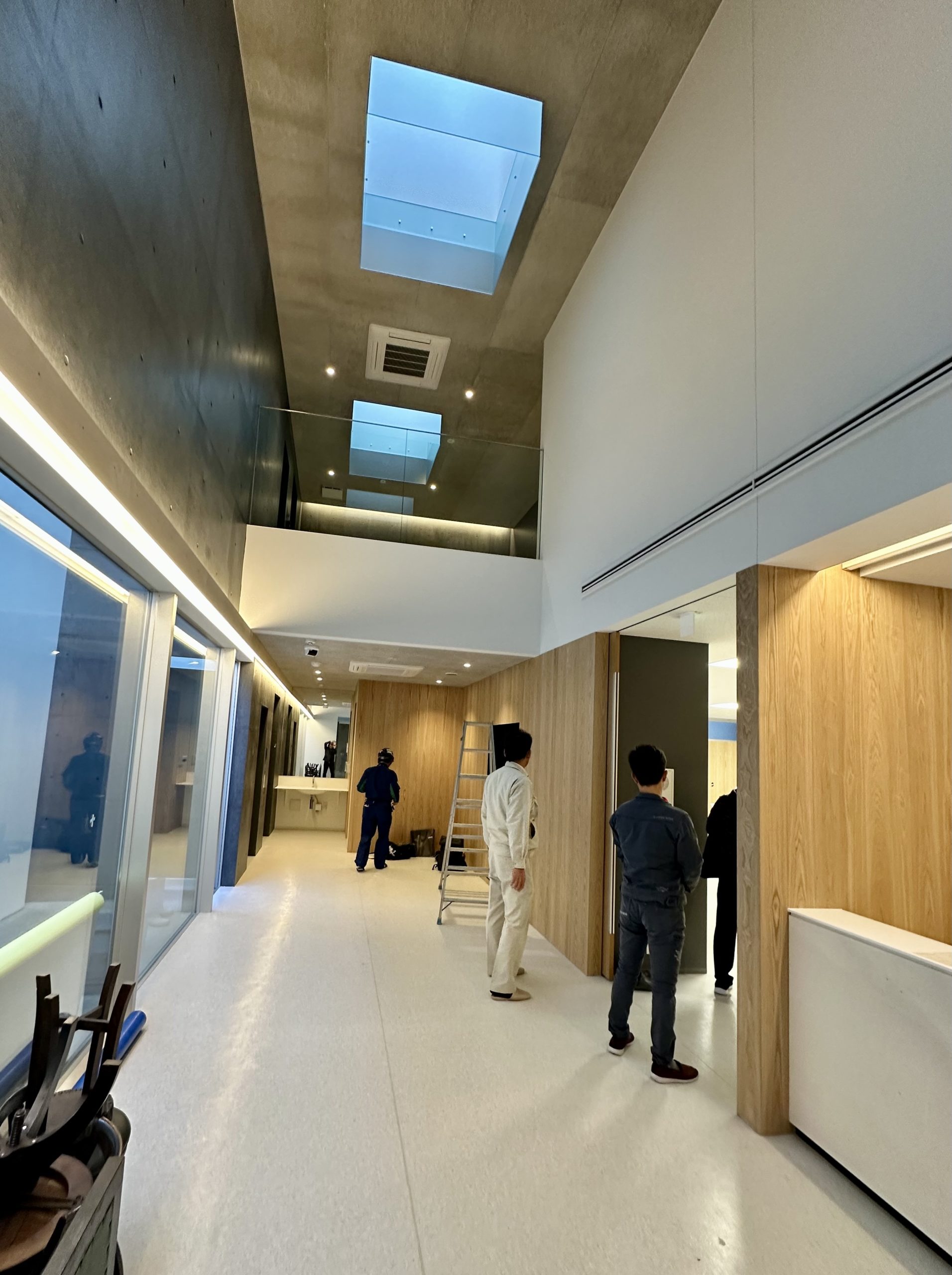 はい。小倉の広石眼科の建築検査が無事完了して一息です。 今回はコンクリート研ぎ出しやポリカーボネートのガラス色のトップライトカバー等、新しい試みをしました。 院長先生にも喜んでいただき、20日にはお引渡しです。 外観。ブラックコンクリートと白壁のコントラスト 新しい試みのトップライトカバー。曇天の日でも明るく光ります。 チャコールグレーの壁と白木の対比