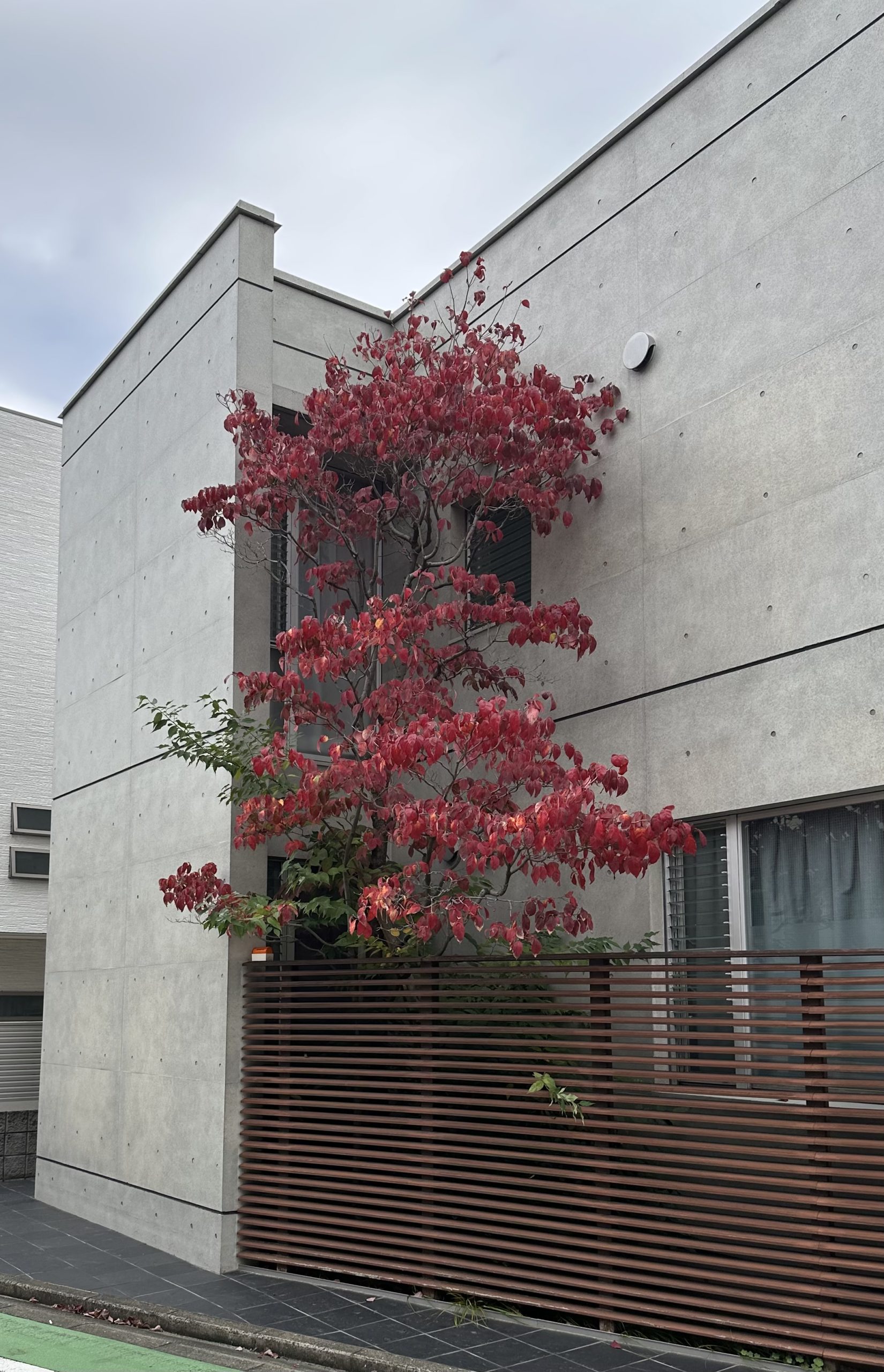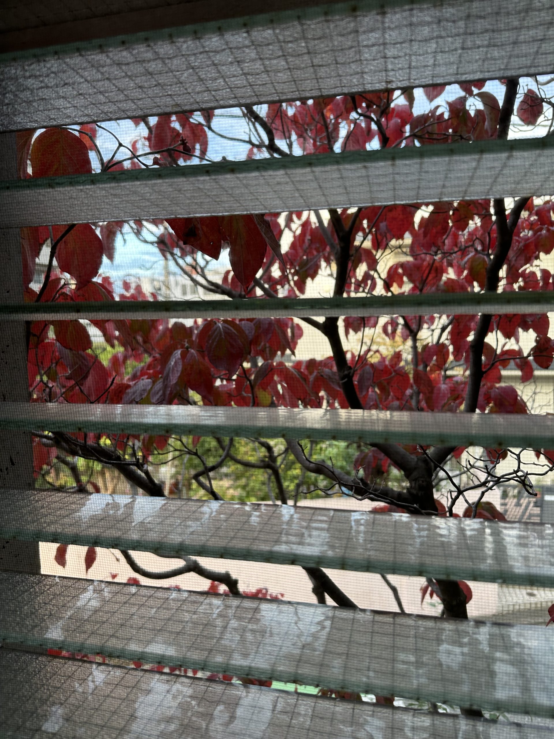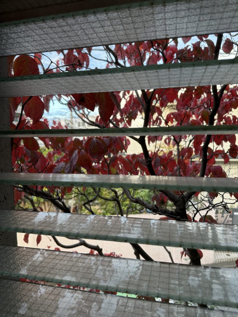 はい。わが家の浴室から見えるハナミズキ。今年は例年にも増して紅葉が美しい。