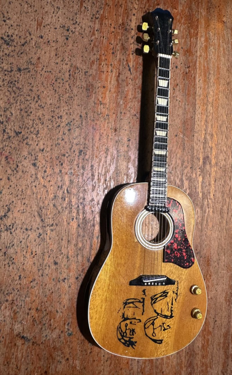 嫁が結婚前にくれた、セイコーの鉄道員に支給されていた時計。今でも巻くと動いてくれます。 20代の頃にかけていたジョンレノンメガネ 今でもバイカー達が愛用しているアメリカのロンソンのオイルライター 日本酒(好みは京都伏見のまつもと)をよく飲んでいた頃に妻からもらった木製のぐい吞み。今は使っていないけど当時はこれで毎晩飲んでいました。 誰にもらったか記憶にないけれど(失礼)ジョンレノンがラブ&ピースの時に使用していたエピフォンのアコギのミニチュア。 音はしないけど細部までよくできています。