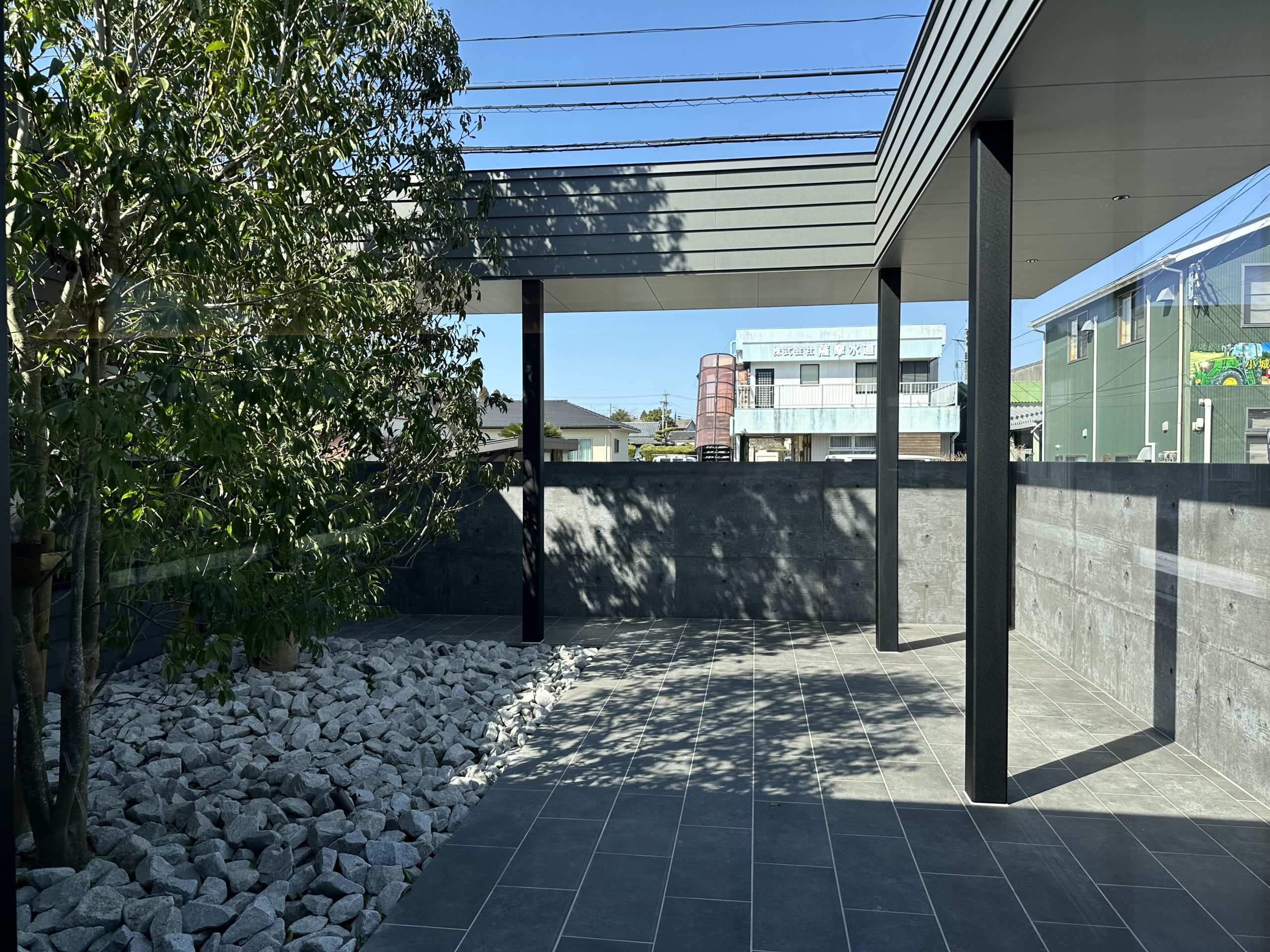 木造でありながら内部にブラックコンクリートを打つことで重厚さを表現し、待合室からはドライエリアが広がりを見せます。