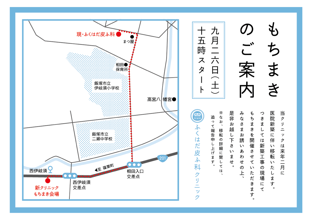 飯塚で建築中の ふくはだ皮ふ科クリニック のもちまきが 9月26日(土) 15:00より開催されます。 みなさまお誘いあわせの上、ぜひお越しください! &nbs…