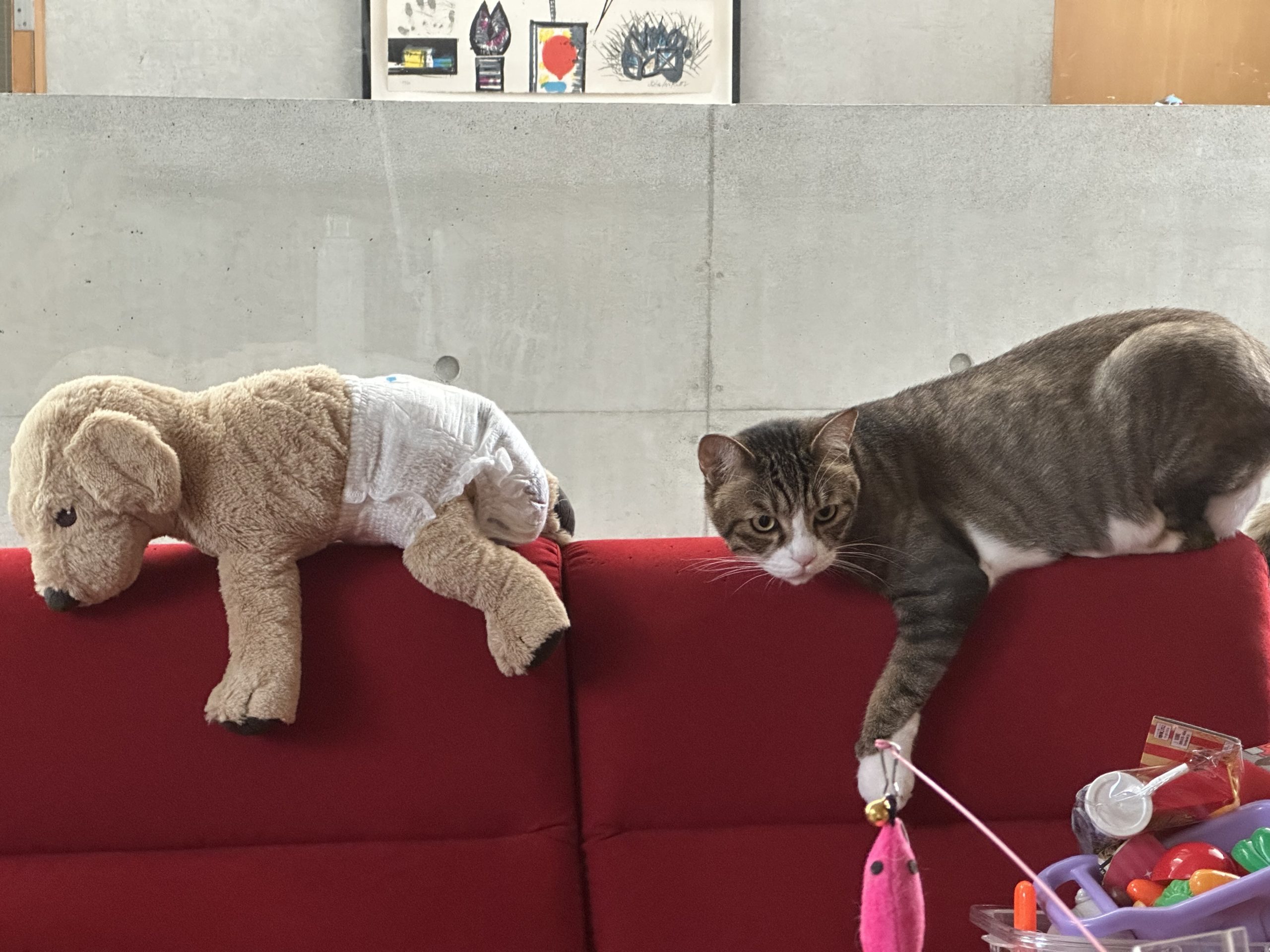 はい。 銀ちゃん、クーラーの効いた部屋でぬいぐるみと一緒に暑い夏を過ごしています。