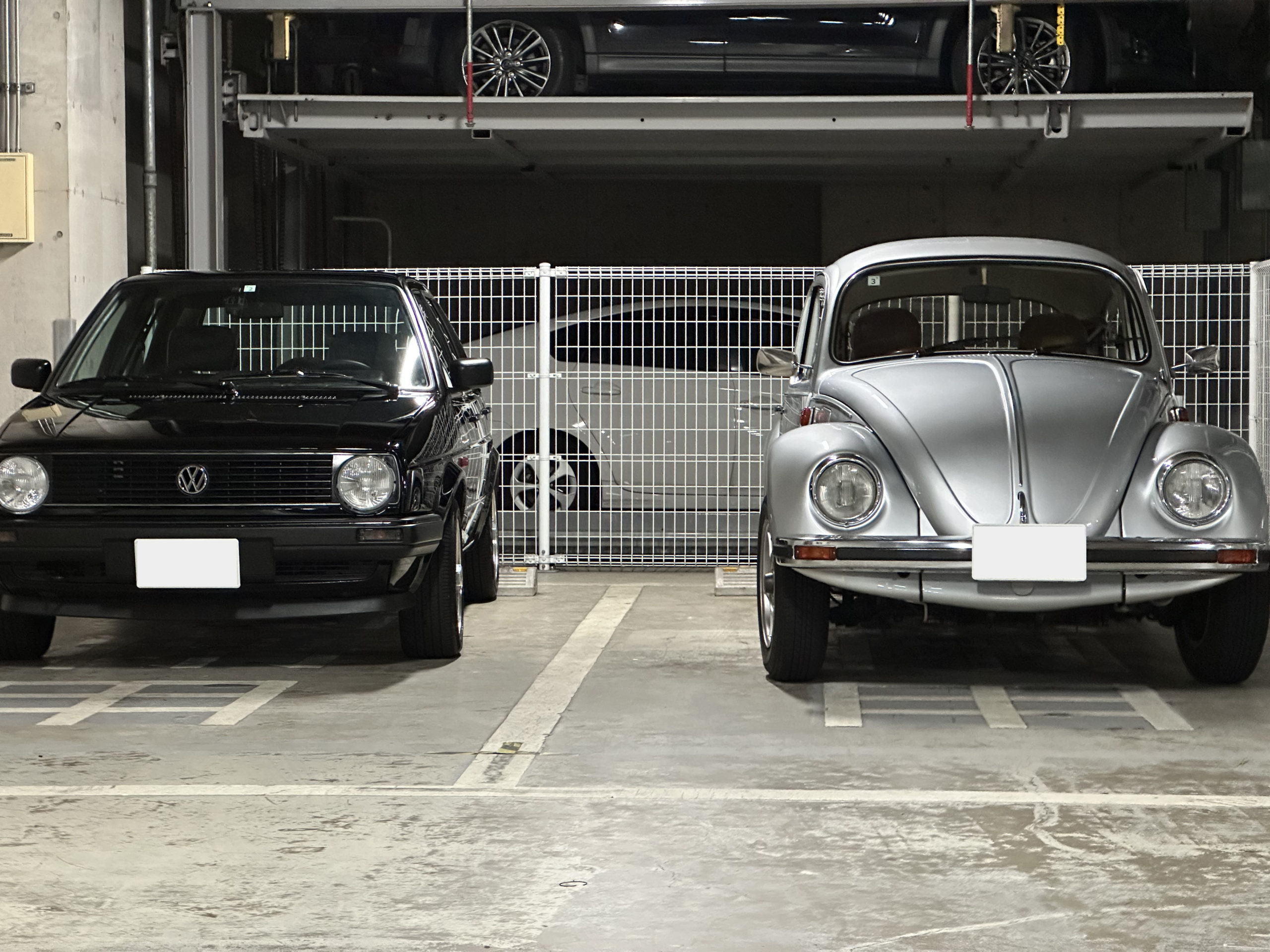 はい。 スタッフのシルバー色のビートル(77年型・独製)、GATの社用車ゴルフMK2(90年型・独製)を並べてみました。 歳の差は13歳。どちらもいい歳なので、…