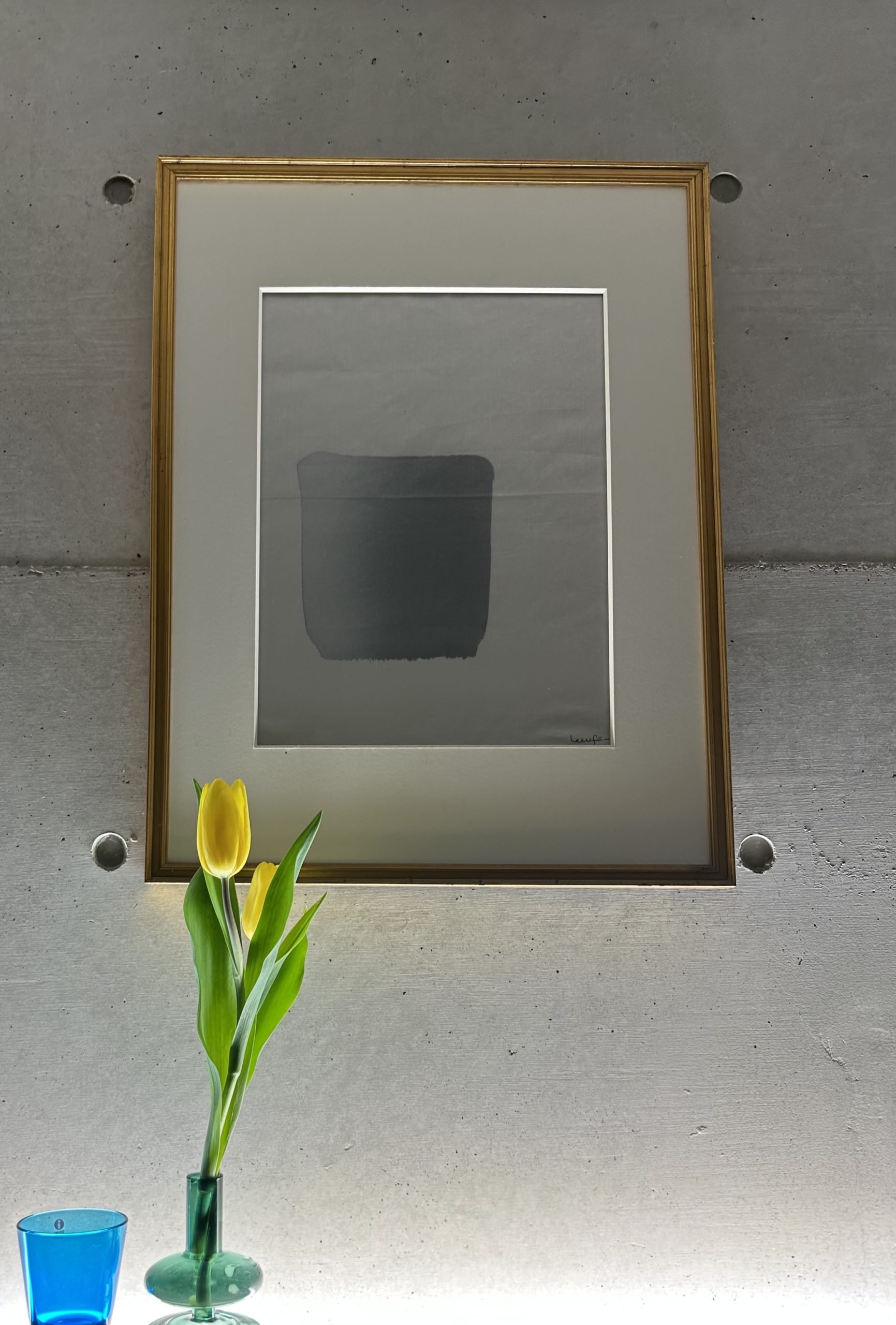 はい。李禹煥のアートと若手ガラス作家の一輪挿しに黄色いチューリップ。 それとイッタラのブルーガラスのタンブラー。好きな組み合わせです。